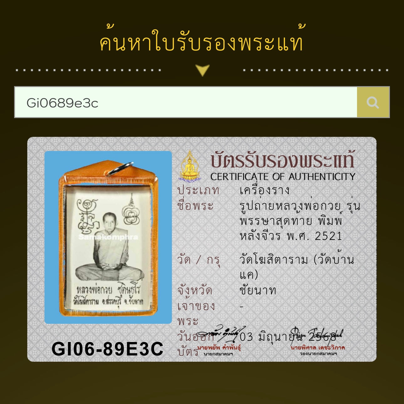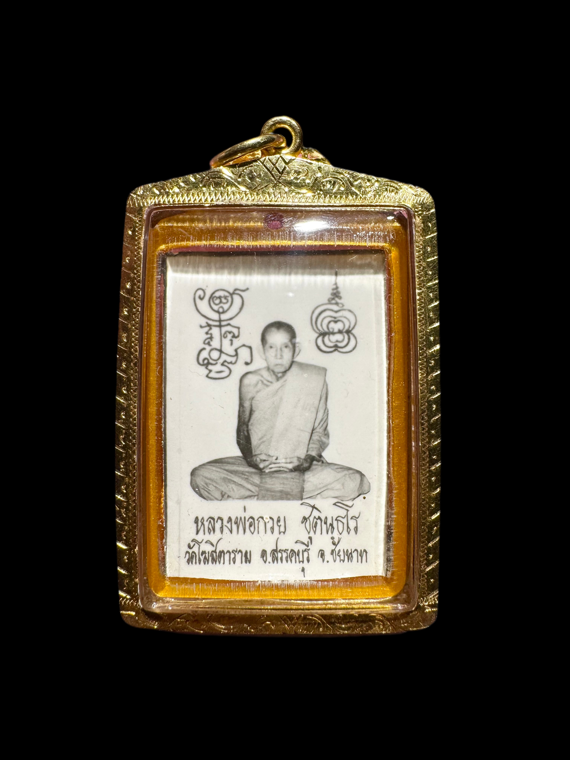 The Loop Tai Amulet (BE2521 / 1978) is a special medallion created during his lifetime. The front depicts Luang Phor Kuay in meditation, while the reverse features sacred yantra scripts and monk robe. Each design carries strong symbolism of protection, victory, and good fortune.